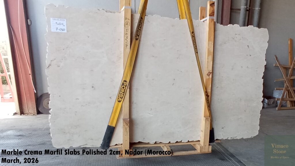 Crema Marfil marble slabs – polished finish, 2cm thickness.